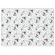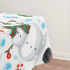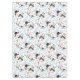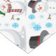 Discover Christmas themed tablecloth with a cheerful snowmen in top hats and scarves, holding candy canes. Green trees and blue snowflakes create a festive winter mood.