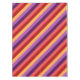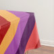 Un mantel de 52" x 70" con un motivo de color de rayas diagonales en rojo cereza, rosa melón, violeta, púrpura de ciruela y amarillo banano.