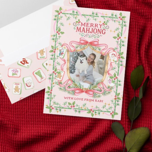 This chic Christmas design features Christmas mahjong tiles on a blush pink background. Perfect for you holiday mahjong party.