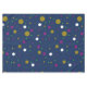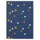 Un patrón de círculos de diferentes tamaños en oro, blanco, púrpura y verde se esparce a través de un fondo azul oscuro. Los círculos están uniformemente separados y varían en diámetro.