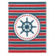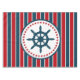 Diseño náutico con decoración de ruedas de vela en forma redondeada con estrellas sobre fondo rayado rojo, azul y blanco