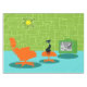 Se dice que los perros tienen propietarios y que los gatos tienen personal. ¡El felino de este tablilla Kitty Tablecloth de la Era del Espacio Retro no pudo estar más de acuerdo! El estilo de los años 60, de diseño artístico minimalista, cuenta con un elegante gato negro en una sala de estar moderna de mediados de siglo. La sofisticada sala cuenta con una pared de piedra verde. La moqueta es aqua con sombras verde azuladas. El mobiliario de la habitación incluye una luz amarilla y sputnik, una tumbona naranja con una banqueta a juego y un televisor verde con orejas de conejo. El afortunado gato negro se puede ver encaramado en el taburete delante del televisor. ¡Su programa favorito está en marcha! En la pantalla de televisión podemos ver a una familia de televisión clásica en blanco y negro resolviendo todos los problemas de la vida en un programa de media hora. Este diseño es perfecto, si lo decimos nosotros mismos.