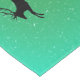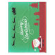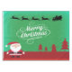 Feliz Navidad! El diseño muestra el trineo y reno de Santa que vuela por el cielo. Las palabras "Feliz Navidad" se exhiben de manera prominente en blanco en el centro. Abajo, Santa mira a un paisaje arbolado adornado con árboles rojos y un jovial muñeco de nieve. La escena está ambientada en un entorno verde y exuberante con coquetas copas de nieve,