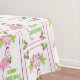 Un mantel con un caprichoso patrón de navidades tropicales. Un flamingo rosa de lujo con una pierna levantada. Con un sombrero rosado de santa y un hueco estacional. Los rincones también están decorados con bayas. Un ramo de flores con caramelos encima de su cabeza. Feliz Navidad escrito con letras verdes y audaces.