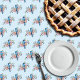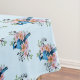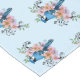 Un pájaro marino azul rodeado de flores primaverales rosas, violetas y color melocotón pastel colocadas sobre un fondo azul claro.