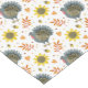 Un patrón acuarela de pavos de color azul-gris, girasoles dorados y bellotas, y corazones y hojas naranjas contra fondo blanco