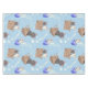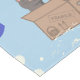 Gatos en tazas y cajas y gotas de leche en el fondo azul