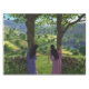 Mujeres jóvenes gemelas se asoman por detrás de dos árboles hacia un exuberante cañón verde entre colinas rocosas, llenas de pequeñas granjas y setos y paredes de piedra y regadas por un brillante arroyo que cae en cascada por las colinas.