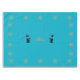 This table cloth is teal blue with the text Merry Christmas in the center in gold letters with two pretty black cats wearing pink bows around their necks and the edges bordered with stars made of more tiny gold stars.