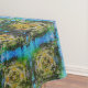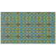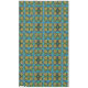 Un patrón vibrante presenta motivos cuadrados repetidos en tonos verdes, amarillos y azules, creando un efecto caleidoscópico. El diseño es simétrico y recuerda a un tejido o a un tapiz.
