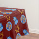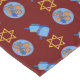 Cookies, dreidels, y la Estrella de David en un fondo rojo profundo.