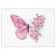 Arreglo floral de mariposa rosa con flores japonesas de cerezo rosadas sobre fondo blanco.