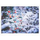 Las gorriones y una paloma junto al alimentador de aves en invierno. Árboles de Navidad cubiertos de nieve decorados con bolas rojas y azules alrededor. Navidades idyll. Tela de mesa de moda única. No olvide elegir otro tamaño de la tela. Utilice el botón Personalizar para ajustar la imagen, si es necesario (botón de ajuste/relleno). También puede transferir este diseño a una gran variedad de otros productos, simplemente elija un producto de una línea a continuación. ¡Diviértete y sé feliz!