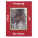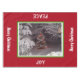 Escena invernal festiva con árboles cubiertos de nieve y ramas arbóreas en una noche de invierno. Un árbol de Navidad brillantemente iluminado se sienta a la distancia todo dentro del marco verde del centro blanco. Feliz Navidad se escribe a lo largo de ambos extremos con letras de texto blancas cubiertas de nieve. Paz y Alegría están escritas en textos blancos lados largos de tamaño pequeño. Fotografía original y diseño © TamiraZDesigns.