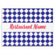 Este mantel tiene un patrón de tablero de ajedrez azul y blanco. Un guión rojo está en el centro. Puede editar el texto para mostrar el nombre de su restaurante.