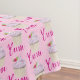 Un mantel con un estampado repetitivo de un delicioso quequito rosado con ribetes escrupulosos de helado rosa con un portaquetería amarilla. Una frambuesa con tallo y hojas en la parte superior. Soñador y delicioso. El texto dice Yum con un elegante y moderno tipo de letra. Situado en un entorno rosa pastel.
