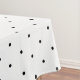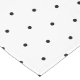 Este mantel presenta un patrón clásico de puntos de polka negros sobre fondo blanco.