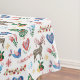Esta tela de mesa temática de Navidades festivos está cubierta con imágenes de estilo escandinavo, incluyendo reno, corazones de patrón, un árbol de vacaciones, flores, copos de nieve, y más. Los colores son rojo, verde, dorado, azul y marrón. Todo está colocado sobre un fondo blanco. Único y colorido.