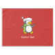 Un pequeño pingüino personalizado con sombrero de santa y bufanda verde caminando sobre la nieve.