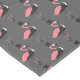 Un mantel de flamingo divertido con un patrón de flamencos rosados en tubos y sombreros altos sobre un fondo gris.
