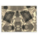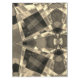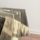 Impreso con rectángulos y cuadrados irregulares, algunos alineados, pero inclinados. En los colores marrón claro, madera o beige, con tonos oscuros y manchas que pueden causar la percepción de terciopelo hecho con brillo, y algunas líneas que separan los "objetos".