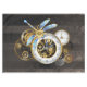 Diales antiguos con artes de oro y latón, decorados con libélula mecánica sobre fondo marrón, rayado. Steampunk.