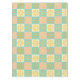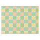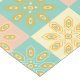 A seamless pattern with geometric floral motifs in yellow, pink, and teal on pastel squares, creating a vintage, harmonious, and cheerful design.