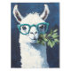 Playful twist to cute animal art and humor with a quirky white llama rocking teal glasses and holding a leafy branch.
