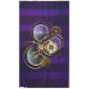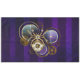 Araña de acero de oro y acero con relojes antiguos decorados con artes dorados sobre el fondo morado, rayado, texturado con lentes y engranajes de latón. Estilo Steampunk.