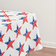 Este mantel se muestra con un color de fondo blanco y tiene una impresión patriótica de estrellas rojas, blancas y azules del 4 de julio. Personalizar este artículo o compra tal cual. Imagen de stock