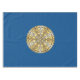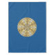 Una mandala de círculo concéntrico de color azul oscuro con puntos azules brillantes y con estrellas doradas esparcidos entre las capas y un brillante círculo de gradiente de ráfagas de sol detrás hace que el diseño sea divertido y que tenga en mente un cielo estrellado nocturno y un día soleado brillante con una imagen.