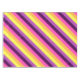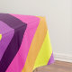 Un mantel de 52" x 70" que presenta un diseño de patrones adorable y colorido de rayas diagonales en púrpura de ciruela, lavanda, amarillo limón, naranja de melón y magenta brillante.