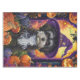 Admire el espíritu de Halloween con este diseño encantador que presenta un perro lindo en un gorra de brujas rodeado de calabazas talladas. Perfecto para añadir un toque de encanto espeluznante a sus celebraciones festivas.