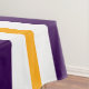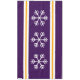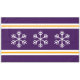 Este diseño festivo de temporada presenta copos de nieve triples blancos centrados en franjas alpinas elegantes de color violeta, blanco y amarillo dorado.