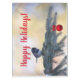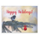 Un chipper Snowbird en un árbol evergreen contemplando un brillante ornamento rojo deseándote a ti y a los tuyos "¡Felices Fiestas!" Elegante, dulce, natural.
