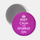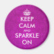 Manténgase tranquilo y reluciente sobre los imanes purpurinas rosas. Redondo Mantener imán tranquilo con textura falsa de fondo violeta. KeepCalm y tu texto. Crea tu propia parodia graciosa. Brillantes brillantes y brillantes purpurinoso. Tipografía de glam para mujeres y chicas.