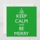 Divertido por las vacaciones. MANTENGA CALMA Y SEA FELIZ con un árbol de Navidad con copos de nieve. Diseño basado en el poster británico de moral de 1939 "Mantenga la calma y siga adelante".