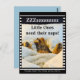 ¿No puedes encontrar a tu perro? Intenta mirar en la habitación. ¡Es la hora del almuerzo y este Yorkie no quiere ser molestado! Mantén el ruido bajo, pero diviértete personalizando esta adorable postal Yorkie durmiendo con tus propias leyendas o borrando el texto y disfrutando solamente de la foto. También puede cambiar el color de la parte posterior de la tarjeta cuando edite.