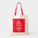 Una bolsa de asas adornada con una reproducción de la lectura británica del poster de 1939 WWII "guarda calma y continúa"