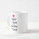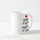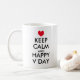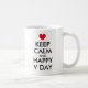 Mantente tranquilo y feliz taza de café del Día de San Valentín. Cute taza con el corazón rojo. Mantengan la calma y sigan con el meme con poco corazón. Humor de tipografía día de San Valentín. Graciosa idea de regalo para novio o novia enamorada.