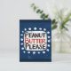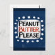 "Mantequilla de maní, por favor" es un lindo diseño de texto en azul con texto en negro y rojo, junto con una forma de acento blanco y puntos caprichosos de textura blanca que lo rodean.