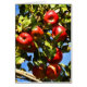 Esta tarjeta de nota estacional del espacio en blanco de la bella arte ofrece una escena del otoño de un manzano por completo de manzanas rojas deliciosas, rodeado por las hojas verdes y el cielo azul.