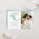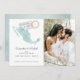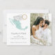 Esta foto para guardar la tarjeta de fecha es la forma perfecta de anunciar sus planes de boda de destino! Presenta un mapa de México sobre un fondo acuático con un pequeño corazón en el mapa cerca de Los Cabos. Hay dos sellos de cancelación de pasaportes que revelan la fecha de tu gran día. Todos los detalles importantes del boda se pueden personalizar.