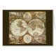 Mapa del mundo antiguo del ilustracion vintage con ambos hemisferios, c. 1680. Por el cartógrafo Frederick de Wit (1629/30-1706). Frederick de Wit (también conocido como Frederic, Frederik, Frederico, Fredericus. de Witt y de Widt) fue un vendedor de papel y mapas holandés. Terrarum Orbis. Este mapa antiguo presenta los hemisferios oriental y occidental, así como los polos norte y sur. Los ilustraciones de estilo barroco en las esquinas representan los cuatro elementos: Fuego con Plutón llevando Persephone, al que asisten Cerberus, el tutor de tres cabezas de Hades, mientras la escena de la batalla arde en el fondo; Aire como reino celestial gobernado por Zeus y Hera, rodeados por criaturas aladas y otros dioses; Agua con el dios del mar Neptuno, mermen, una ballena espinosa, barcos de vela a lo lejos, y la Tierra representada por una escena con desfiles que presentan a tres diosas con frutos de la cosecha y el ganado.