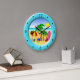 Diseños soleados de Marte del ©. En la playa la diversión embroma el reloj de pared del sitio - estas características redondas grandes frescas lindas, coloridas del reloj de pared de la playa un ilustracion del vector de la diversión de una escena de la playa con los artículos de la playa incluyendo un parasol de playa, una pelota de playa, flips-flopes, un cubo y una espada, palmeras, una toalla de playa y una tabla hawaiana, y un anillo azul alrededor de ella. Hace un regalo perfecto para los amantes de la playa.