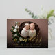 Elegany anuncio de nacimiento de vacaciones para mellizos presenta una sola foto horizontal o orientada al paisaje de sangrado completo con "maravillas de su amor" colocadas en un guión lujoso de Relieve metalizado dorado y letras en bloques. Personaliza con los nombres de los bebés o un mensaje personalizado debajo. Las tarjetas cambian a un fondo con patrones botánicos con las estadísticas de nacimiento de tus mellizos e información adicional. Una hermosa elección para celebrar la llegada de tus Navidades son bebés gemelos.