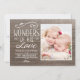 La tarjeta de vacaciones de estilo rústico cuenta con un diseño de tipografía blanca decorativa "Maravillas de Su Amor" con acentos de diseño de rollo y texto personalizado en un fondo de madera gris / marrón deteriorado. Personalice con su foto favorita del año. Un patrón de diamante sobre la textura de la veta de la madera aparece en la parte posterior de la tarjeta plana.
