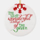 Navidades bonitos adornan cerámica de vacaciones con nuestro maravilloso diseño de Navidades con tipografía de texto rojo y verde que lee La Hora Más Maravillosa del Año y tiene un copo de nieve rojo. ¡El reverso tiene un texto decorado que dice Feliz Navidad y un área para el personalizar con tu nombre familiar, nombres de pila y el año actual!