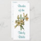 Una hermosa tarjeta que es perfecta para usar como marcador para tu biblia. La parte delantera tiene una cruz azul cubierta de flores. La parte trasera tiene los libros del nuevo y viejo testimonio.