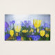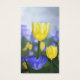 Los tulipanes amarillos y azules soleados destacan en un campo en una fresca y neblina mañana de primavera. Al amanecer temprano se destacan como copas doradas de luz.